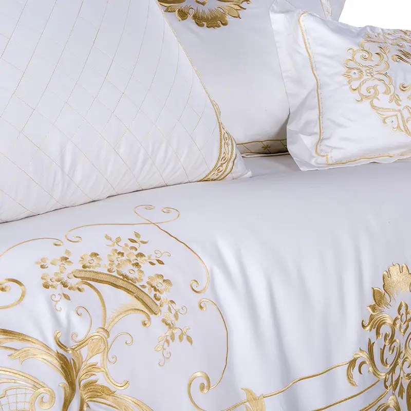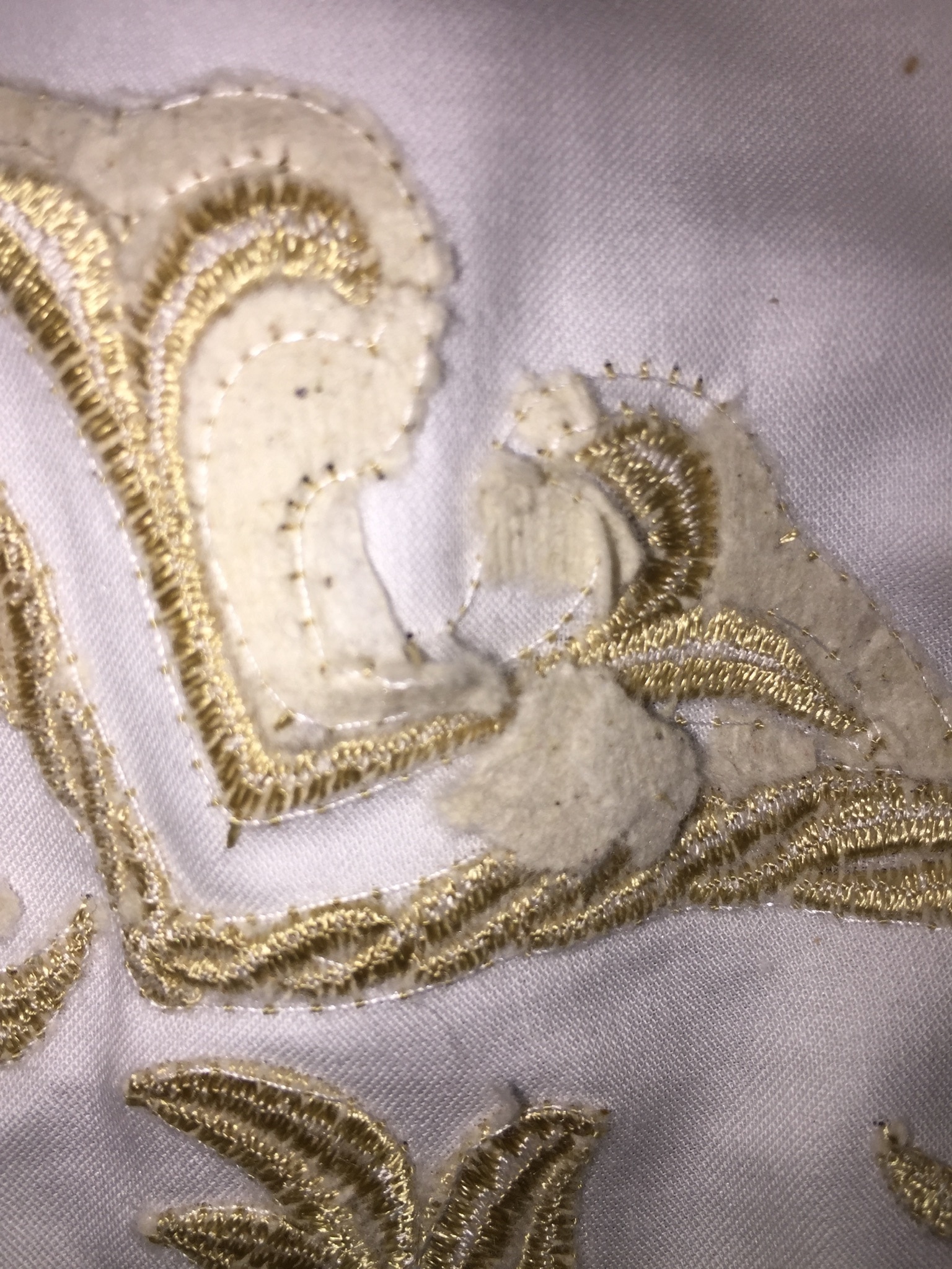 First impressions love the whole set. I am happy to find something in all soft cotton with beautiful gold embroidery. It does not fit my thick mattress but I knew that already by measuring my bed. I plan to add fabric to the sides so it covers better. I would love an option in the future for bigger size to fit a California king bed, high mattress. I did attach photos of the inside. If this was given as a gift I would reconsider or tell the recipients that they will possibly have to pick the facing off on the inside. Some of the facing comes off in laundry and some does not. With the white duvet you can see there was something inside it after drying. I spent some time picking it off. For me this was a minor inconvenience and does not change my opinion. I love this set. Shipping was as expected. Very satisfied. I would consider being a seller of this product. I wish there was an option for a light aqua blue color. Overall I am very happy.